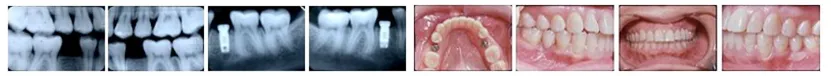 This 17 year old girl was referred to us after orthodontic treatment. Two single implants were placed and porcelain crowns were made for her. Done in this manner we did not have to grind her natural teeth to make a conventional fixed crown and bridge, and the cost was effective.