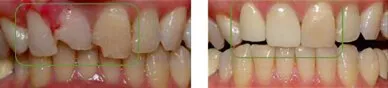 Patient fell down and the upper 3 teeth were damaged. Two teeth were restored the same day with ceramic crowns (Cerec). One tooth was restored with resin. The photo was taken after 3 weeks.