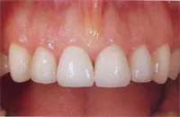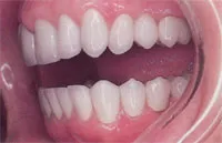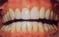 After: The patient has received eight maxillary and six mandibular porcelain veneers. Note the lack of over-contouring, the unseen margins, and the striking color change.