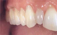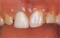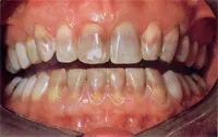 Before: Appearance of a severe tetracycline-stained case before placement of eight maxillary and six mandibular porcelain veneers.